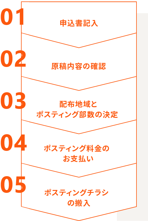 お申し込み完了後、当社へ搬⼊して下さい。「請求書」と「搬⼊依頼書」をFAXにて返送いたしますので、ポスティング開始⽇の2⽇前(⽇曜・祝⽇を除く)AM10:00までに指定⼝座へお振込、もしくは弊社にご来店の上、お⽀払い下さいますようお願いいたします。お⽀払いをいただけない場合は、ポスティング出来ませんのでご注意下さい。 ※ポスティング料金は前払いとさせていただきますので、予めご了承下さい。